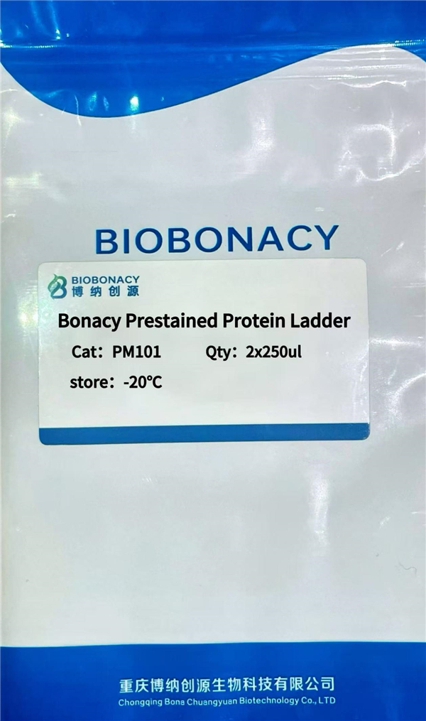 Bonacy Prestained Protein Ladder(10~180 kDa)彩色预染蛋白分子量 Ladder 包含了从 10 kDa 到 180 kDa 共 10 种高度纯化并预染的重组蛋白质( 10、17、25、33、43 、55、72、95、130 、180 kDa, 均带 His 标签) ,其中 72 k Da 条带为橙红色, 10 k Da 为绿色。表观分子量经过 thermo26610 和 26614 非预染蛋白质分子量标准标定。