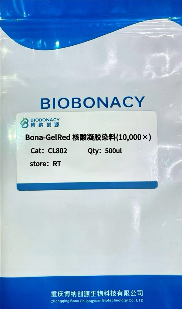 Bona-GelRed 是一种安全、灵敏、稳定的荧光核酸凝胶染色试剂,适用于琼脂糖或聚丙烯酰胺凝胶上的 dsDNA、ssDNA 和 RNA 染色,经过本产品染色的 DNA 条带在紫外光投射下呈现红色荧光,可以替代溴化乙锭(EtBr)。艾姆斯氏试验结果也表明,该染料的诱变性远远小于溴化乙锭(EtBr),使用 更加安全。